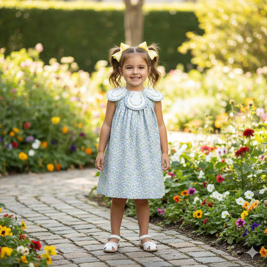 Blue Floral Dress with Embroidered Cross Petal Collar