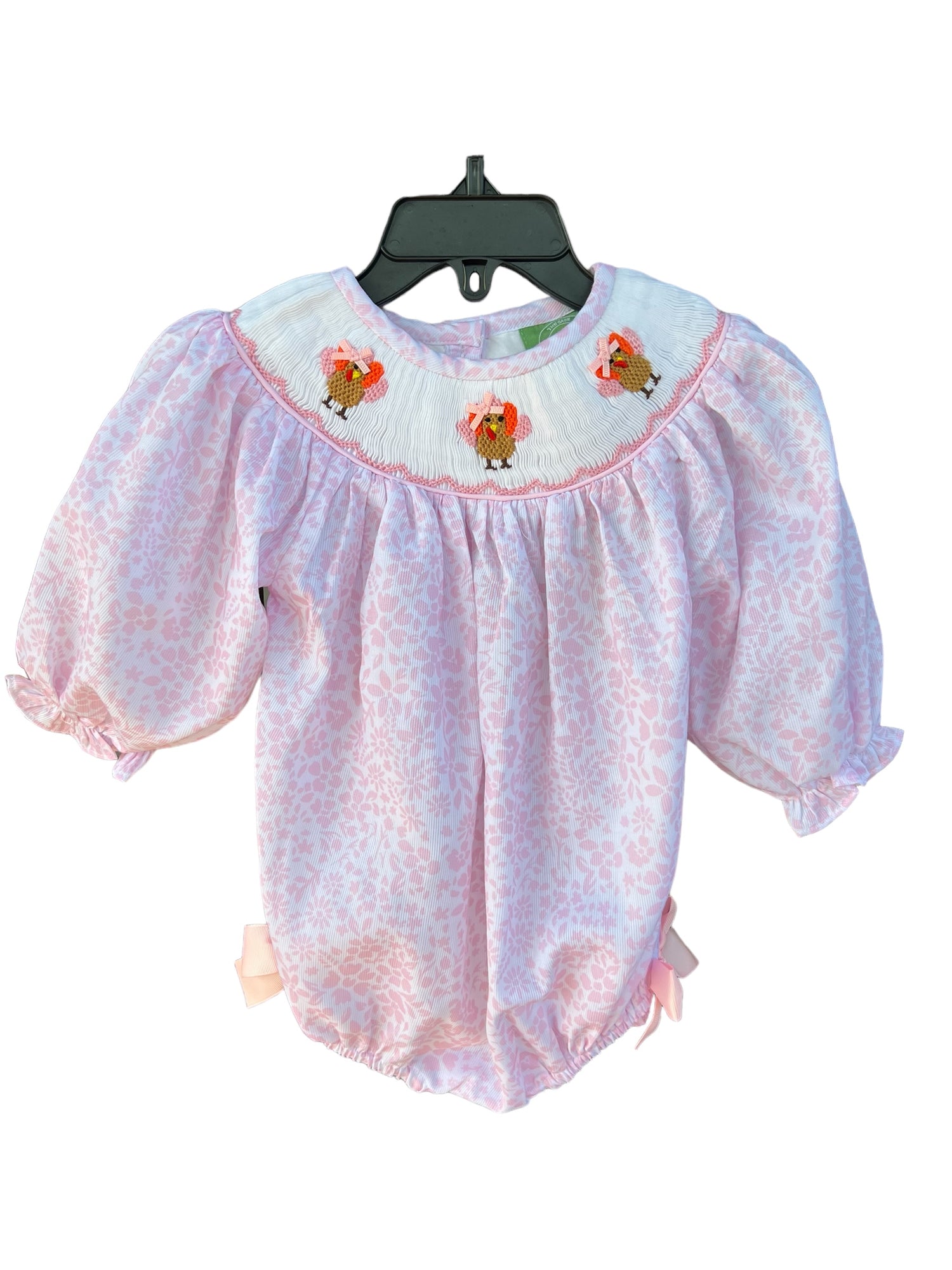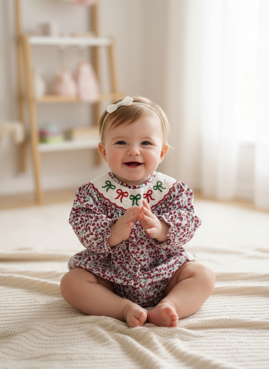 Girl’s Christmas Floral Bow Hand Smocked Bubble | Holiday Toddler Outfit