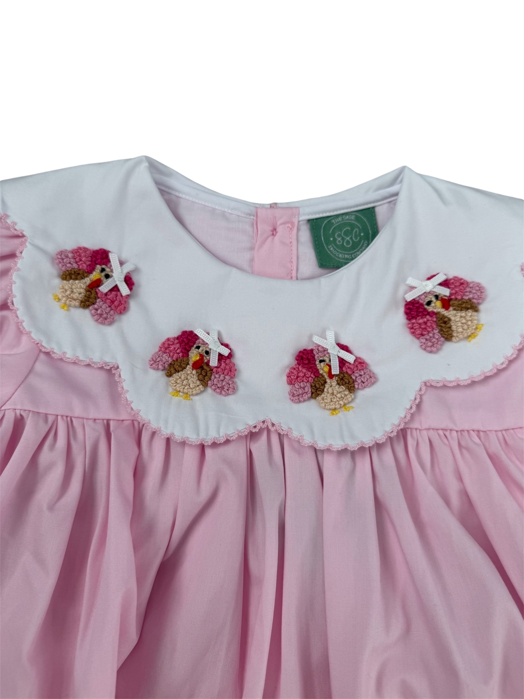 Dress your little one in charming style with this Pink French Knot Turkey Girls Bloomer Set. Featuring a delicate scalloped collar adorned with intricate french knot turkey designs, this long-sleeve outfit is crafted from soft 100% cotton for all-day comfort. The vibrant hot pink ruffle bloomers add a playful pop of color, making it perfect for festive occasions. A matching sister bubble is also available, creating an adorable coordinated look for siblings. Practical and pretty, this set blends timeless details with lively accents for a standout ensemble. Each turkey has a ribbon bow on their head.