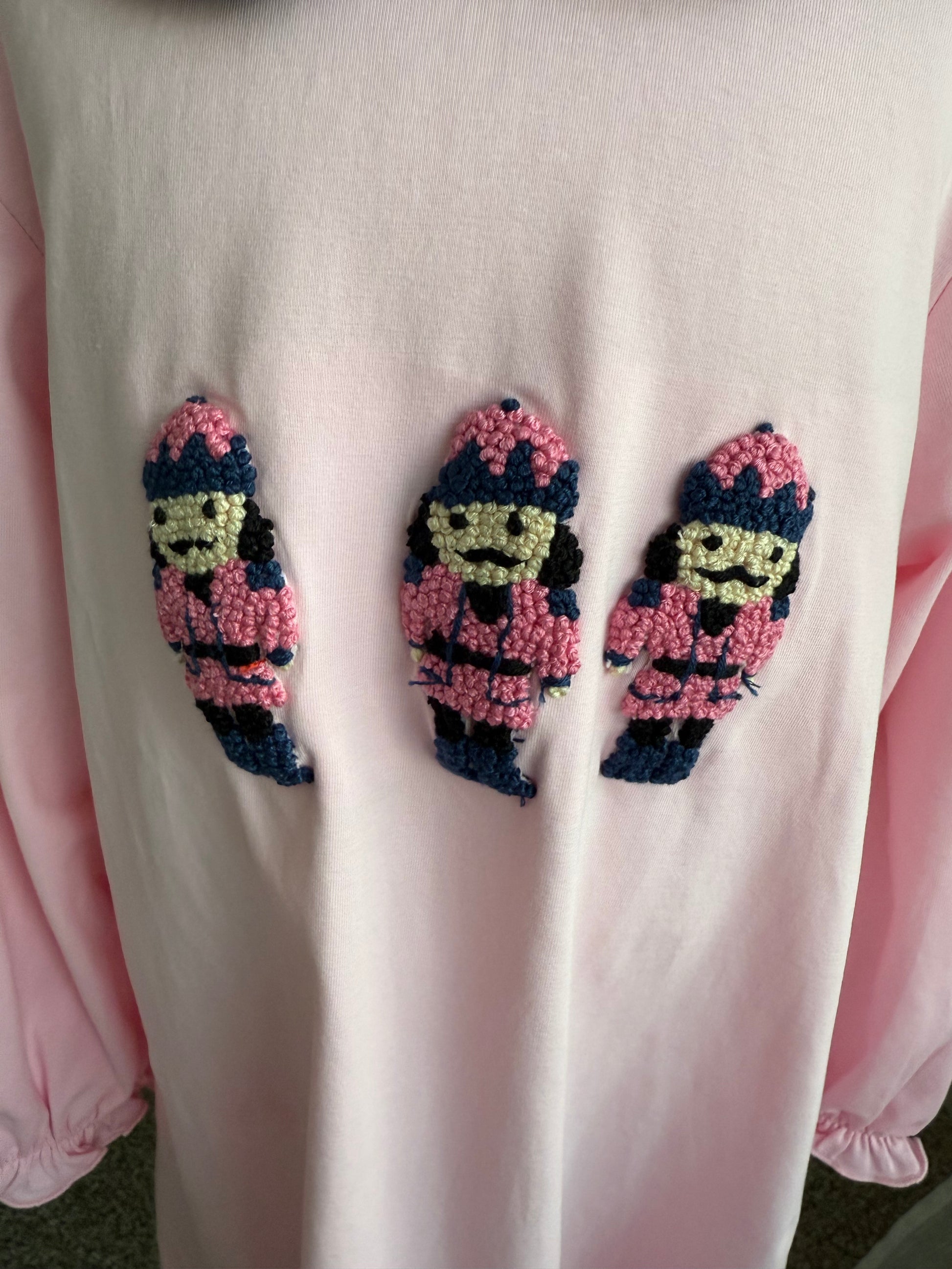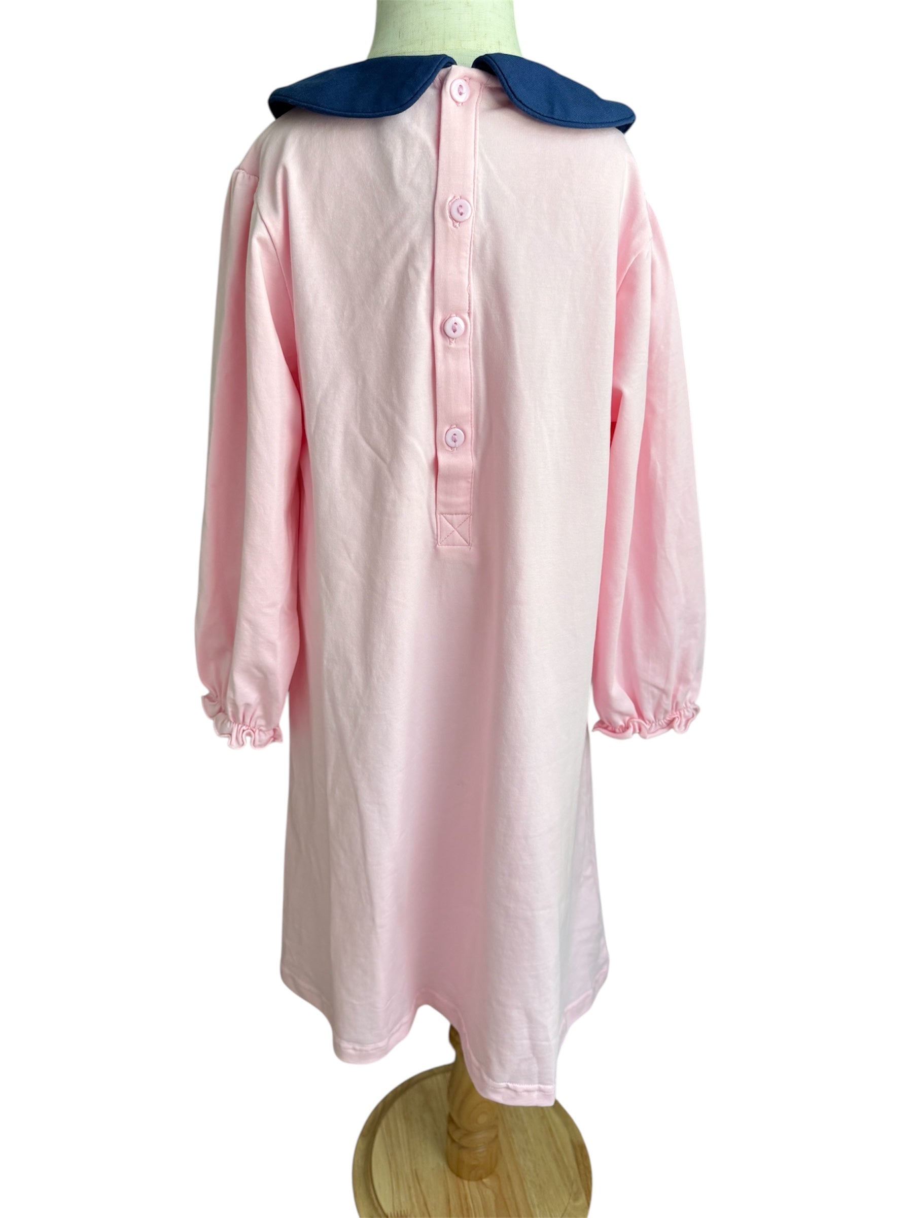 Elegant and festive, this Girls Nutcracker French Knot Dress is a timeless holiday piece. Crafted in soft pink with a navy Peter Pan collar, it features hand-stitched French knot nutcrackers across the front for a classic boutique look. Long sleeves provide cozy comfort, while the cotton-spandex blend ensures softness with just the right amount of stretch. A button-back closure makes dressing simple and polished.