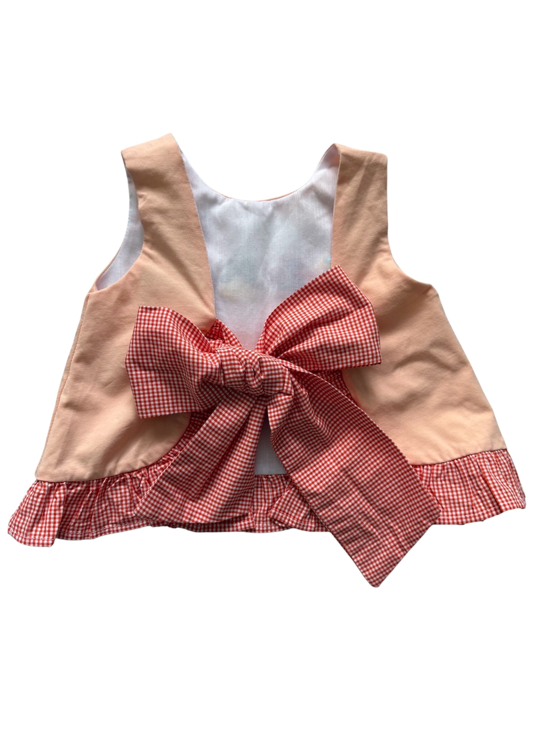 This charming two-piece swingback outfit features a soft blend of 95% cotton and 5% spandex for comfortable wear. The orange top is accented with orange and white gingham trim and showcases 4 embroidered princess holding a jack-o-lanterns, perfect for Halloween festivities. The top ties in a bow at the back for an adjustable fit, while coordinating gingham bloomers complete the look with classic style and ease. Ideal for festive occasions, this outfit combines playful design with quality materials.