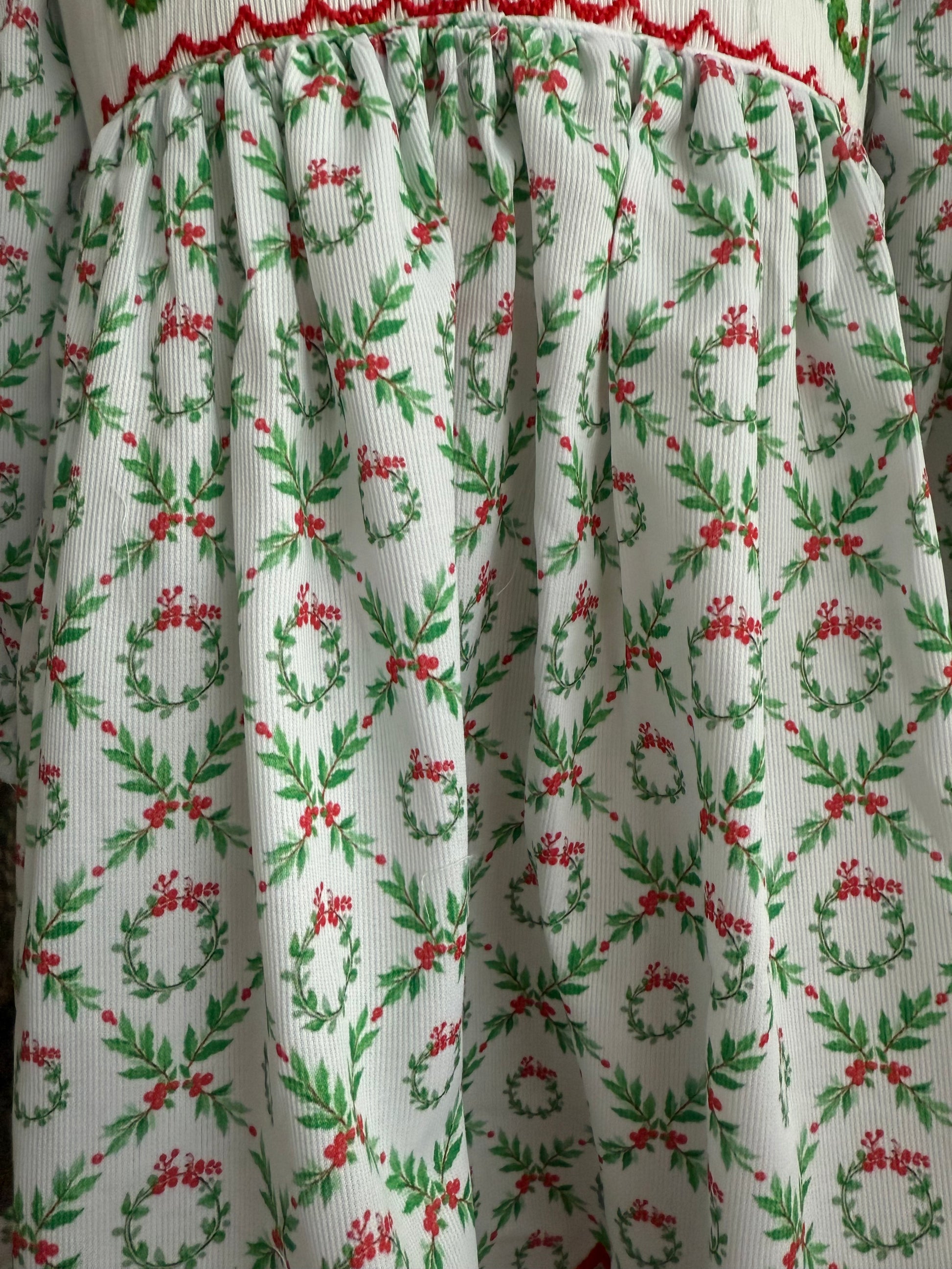 This beautiful hand-smocked Christmas wreath dress is perfect for holiday celebrations and family photos. Featuring a scalloped red collar, long sleeves, and a scalloped hem, this classic design is both festive and timeless. The smocking showcases delicate wreath embroidery, adding a special holiday touch.
