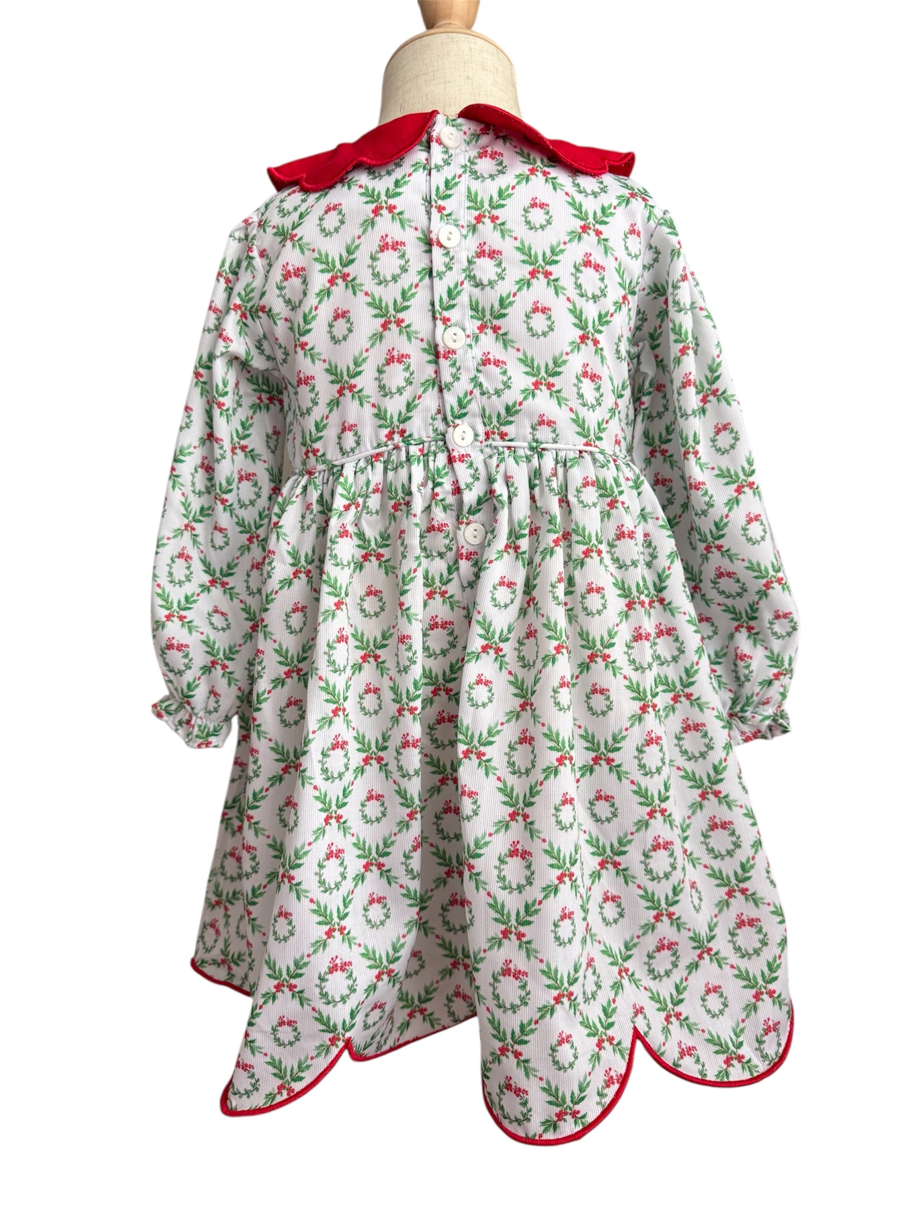 Girl’s Hand Smocked Christmas Wreath Dress with Scalloped Red Collar