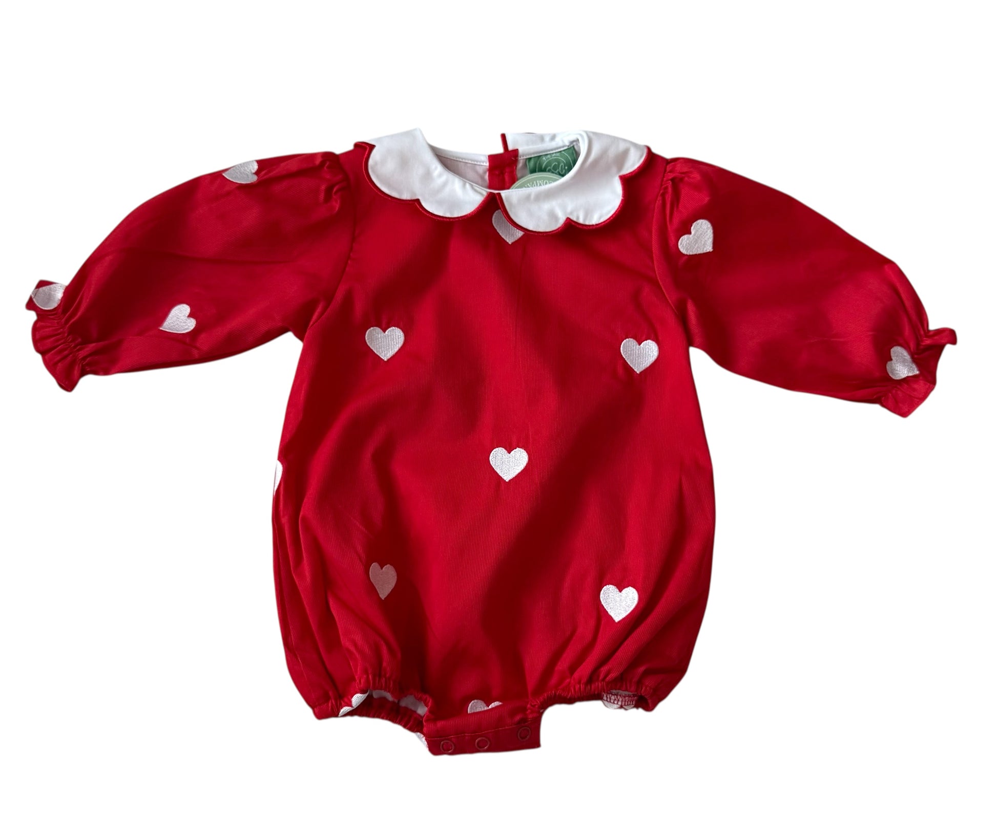 This sweet sister bubble is the perfect match to our girls Valentine dress. Made from 100% cotton and fully lined for comfort, this classic red bubble features white embroidered hearts throughout for a timeless Valentine look.