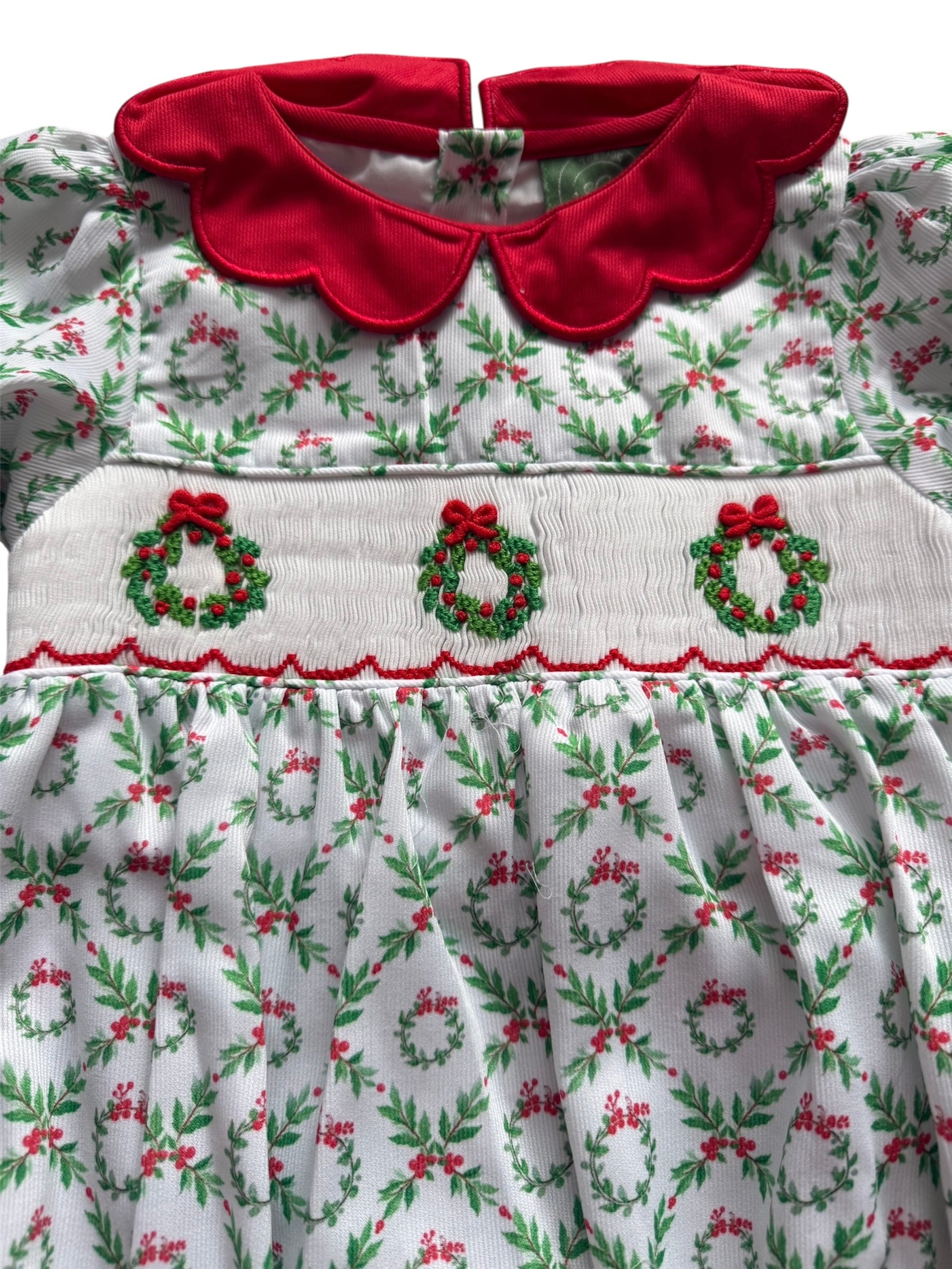 Girl’s Hand Smocked Wreath Christmas Bubble – Holiday Outfit