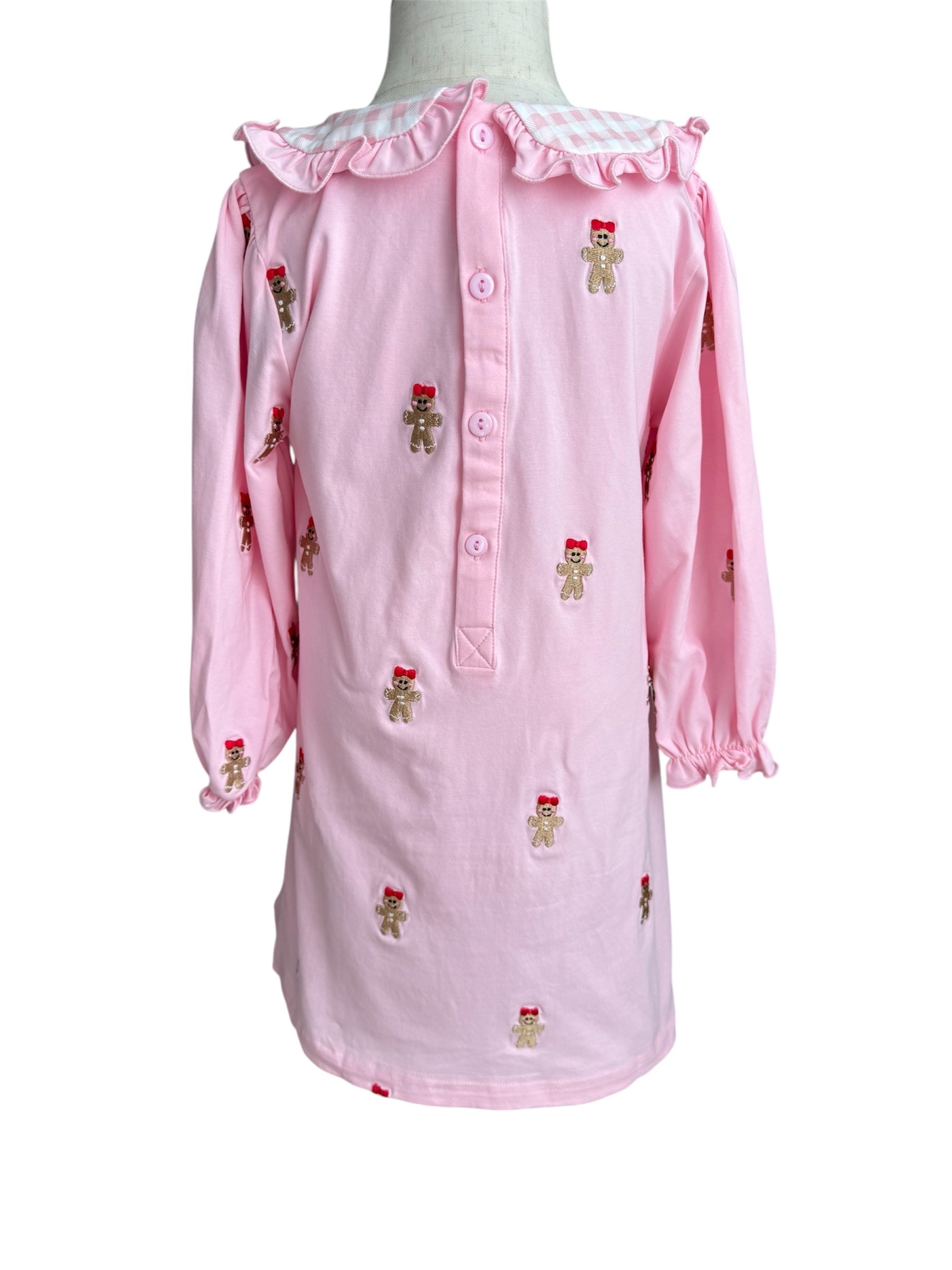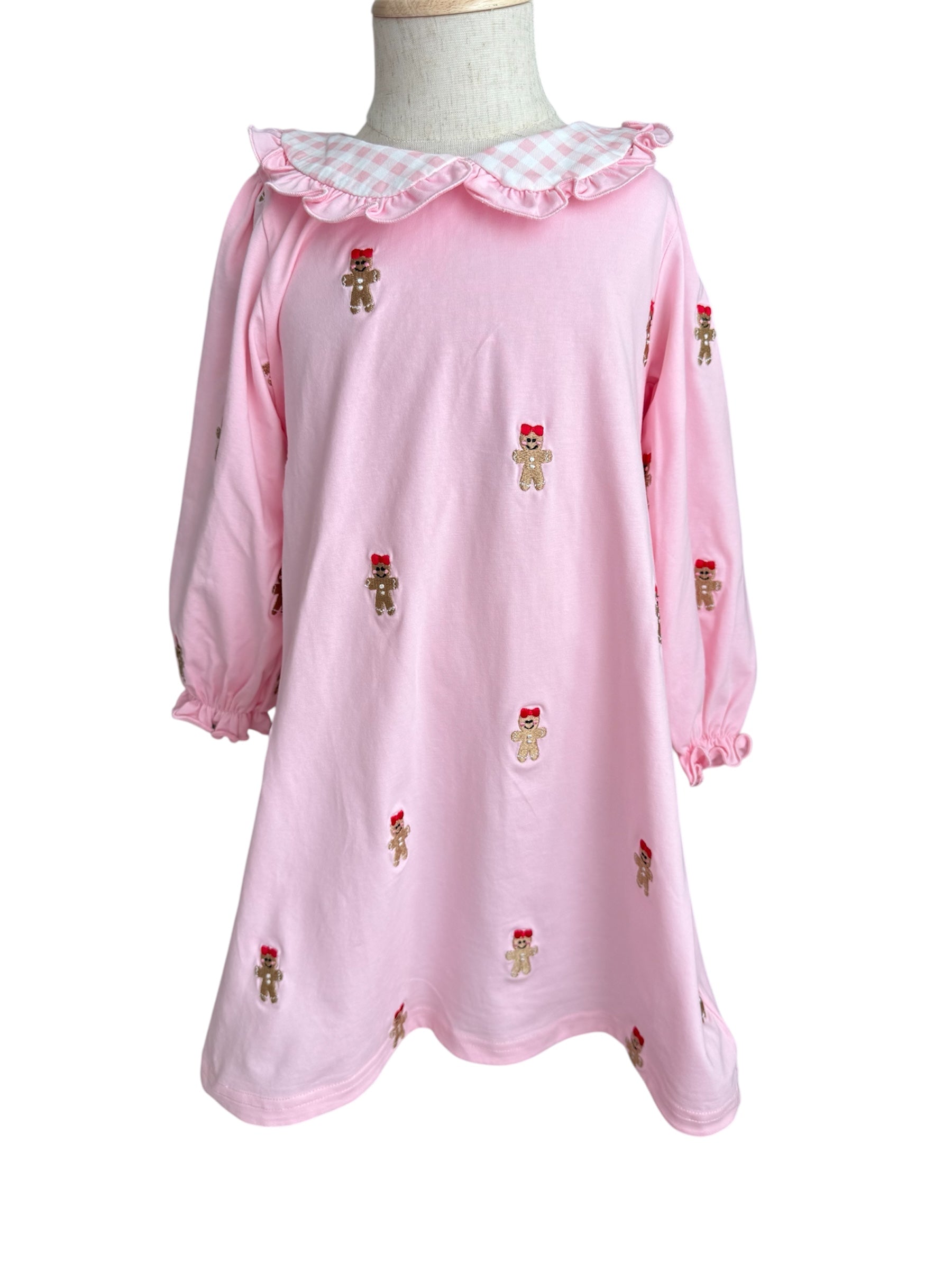 Sweet and festive, this Girls Gingerbread Embroidered Dress is a must-have for the holiday season. Made from an ultra-soft cotton blend with a touch of spandex for comfort and stretch, it features long sleeves for cooler weather and a charming pink and white plaid collar. The light pink dress is delicately embroidered with brown gingerbread motifs, creating a timeless boutique holiday look.