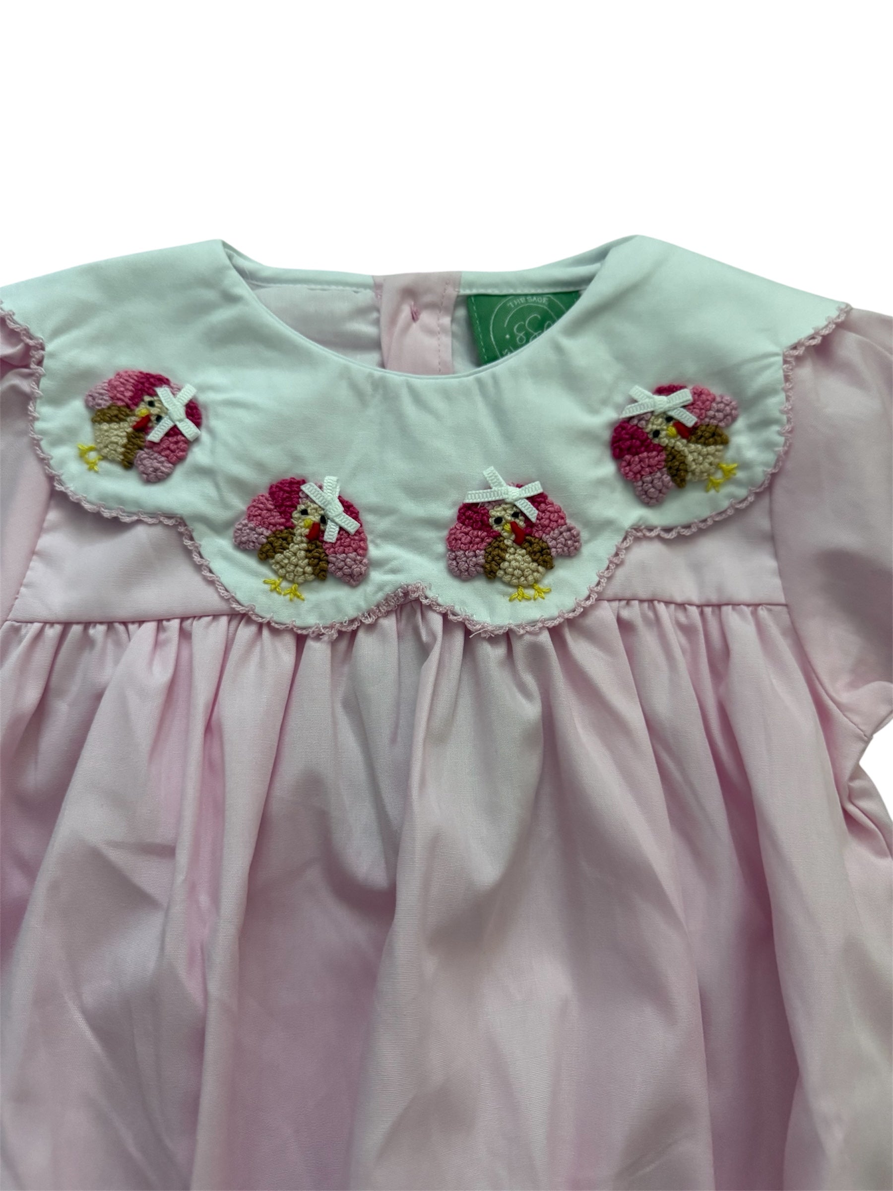 Celebrate the season in timeless style with this Pink French Knot Turkey Bubble. Featuring a delicate scalloped collar and hand-stitched French knot turkey embroidery, this charming long-sleeve bubble is crafted from soft 100% cotton for all-day comfort. The sweet pink hue is accented with dainty bows and festive embroidery, making it a perfect choice for Thanksgiving gatherings, family photos, and holiday celebrations. Convenient snaps at the legs and back ensure easy dressing, while a matching bloomer set creates an adorable coordinated look for siblings. Each turkey is finished with a tiny ribbon bow on top, adding a precious finishing touch.
