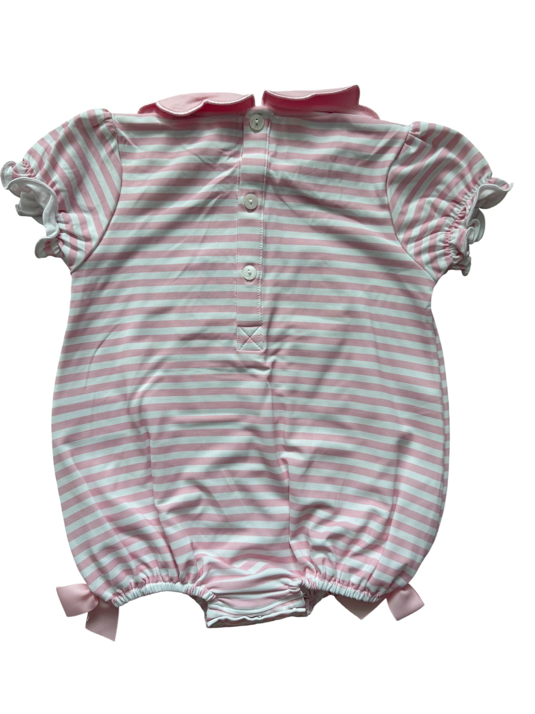 The Puppy Trick or Treat Appliqué Girl’s Bubble combines festive Halloween charm with boutique quality. Made from a soft pink and white striped fabric blend, this bubble features short sleeves, a scalloped collar, and adorable puppy appliqués holding jack-o’-lanterns. Designed with snaps at the legs and buttons at the back, it makes dressing easy and comfortable for little ones.