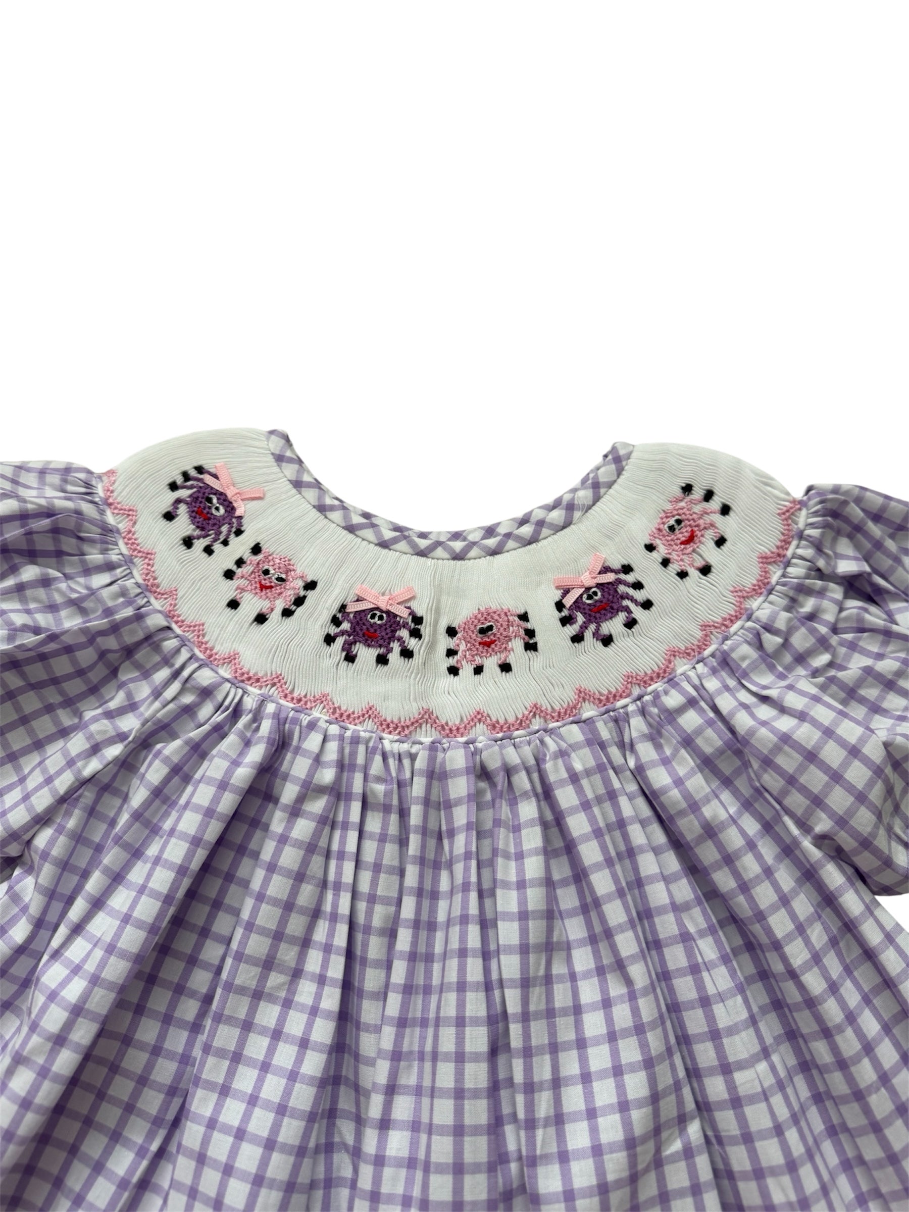 This charming girls' shorts set features a purple and white plaid 100% cotton fabric, expertly hand smocked with delicate spider designs accented by attached bows. The short-sleeve top fastens with buttons in the back for a comfortable fit, paired with soft pink bloomers. A coordinating sister match bubble option is also available, making it perfect for sibling styling. Crafted with attention to detail, this set combines classic craftsmanship with playful design for a timeless look.
