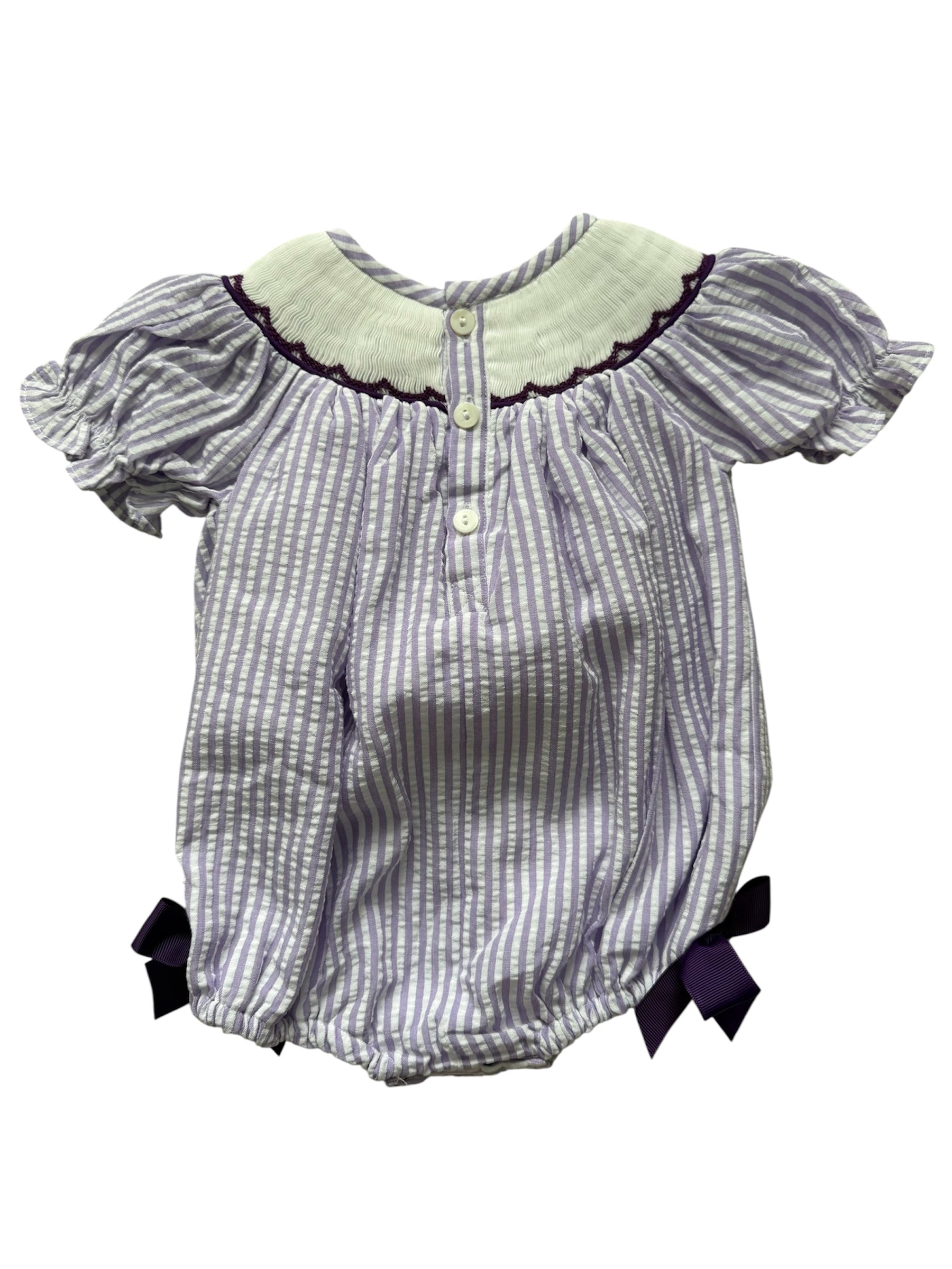 Dress your little one in festive style with our Spooky Mouse Hand Smocked Girls Bubble. Made from soft purple and white striped seersucker, this boutique-quality bubble features delicately hand-smocked spooky mouse characters, making it the perfect outfit for Halloween fun and fall festivities.