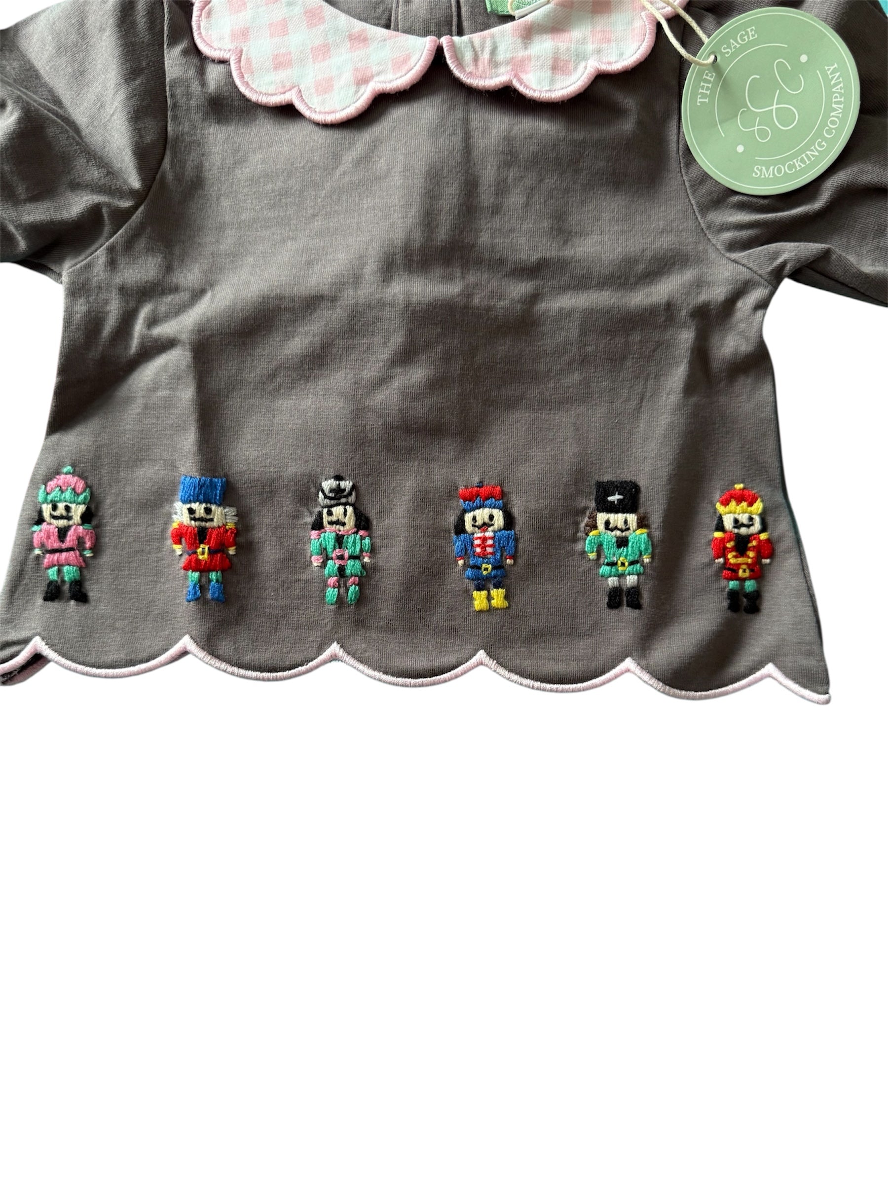 Coffee-colored scalloped top with embroidered Nutcrackers along the hem