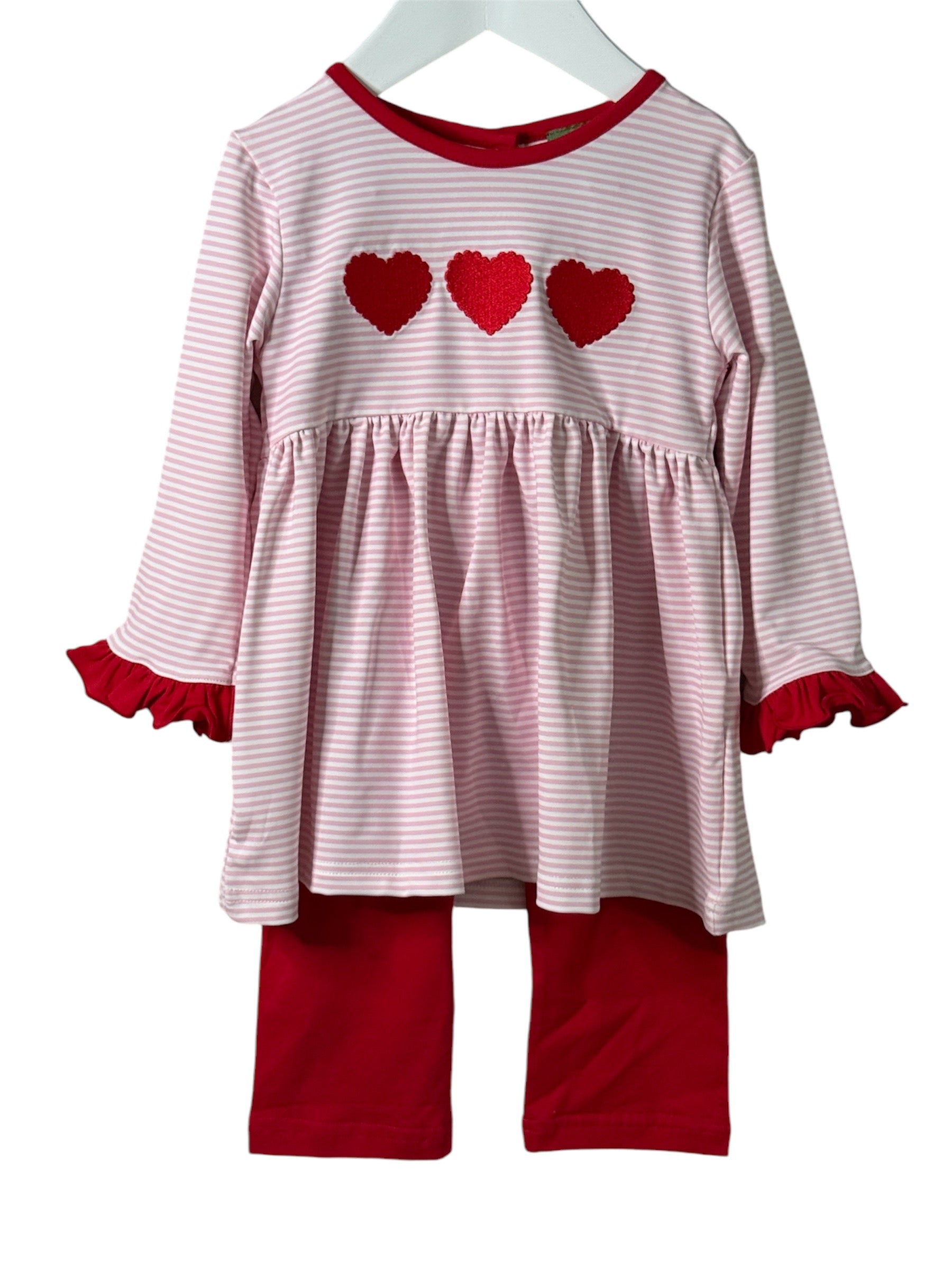 Valentine’s Heart Two Piece Set | Pink & White Striped Top with Red Leggings
